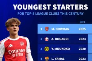 1-道曼(阿森纳)2025年,15岁零9个月