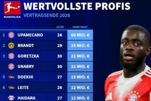 合同将到期的德甲球员身价榜:于帕6千万欧,布兰特、磁卡在列
